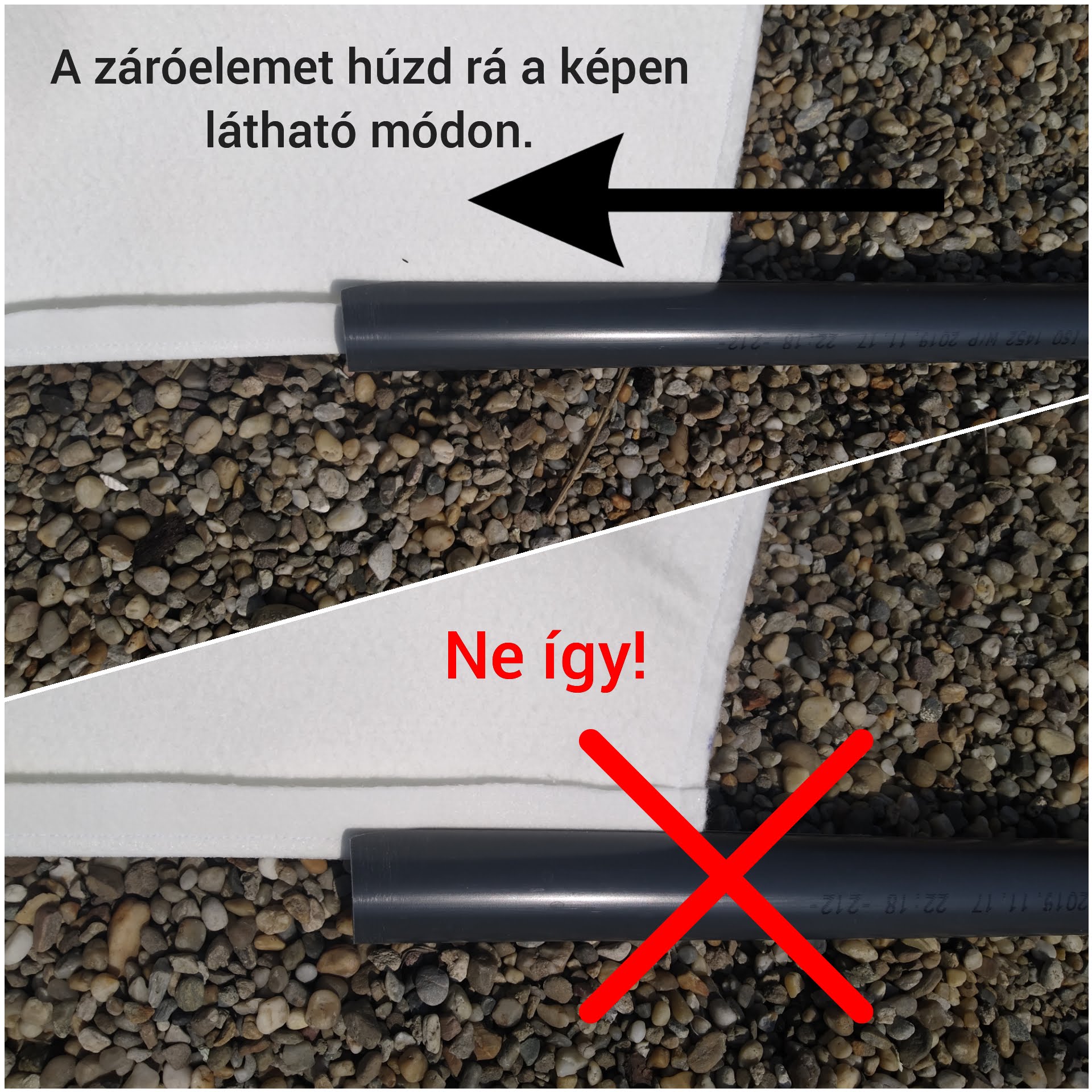 A záróelemet, a bevágás felöli oldalról kezd el ráhúzni a szűrő visszavarrt részére úgy, hogy a visszahajtott rész a záróelemen belül legyen, tehát ne a varráson told végig a záróelemet!